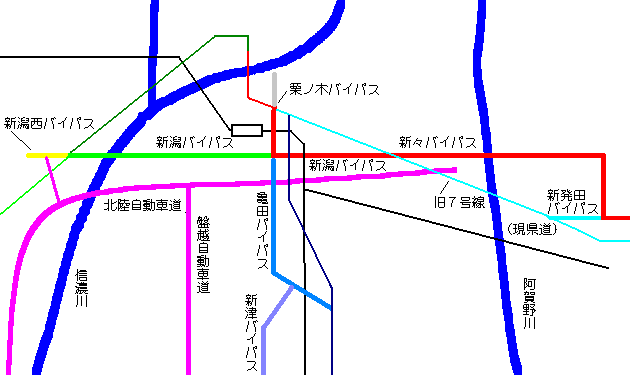 このバイパスは、国道7号線と国道8号線にかかっています。途中国道が切り替わる紫竹山ICが、滋賀県からやってきた国道8号線の終点になっています。国道7号線は、このまま紫竹山ICに接続する栗ノ木バイパスへ入り、万代橋で信濃川を越え、さらに新潟市の中心地の本町交差点まで続き、ここで旧8号線の終点でもある現在の国道116号線の終点とぶつかります。