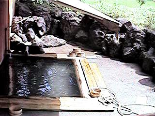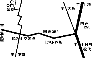 十日町から上越に向かう国道253を走って北越急行の駅のある松代町から左折. 道路の改良も進んだ国道353を行き松之山町の中心地[松の山]交差点を右折. (ちなみにここをまっすぐ行くと3kmほどで松之山温泉街にでる) 結構ぐねぐねして急な坂の続く道路を走り,途中の兎口温泉露天風呂[翠の湯]の 看板のある三叉路で左に曲がりさらに走ると露天風呂の駐車場があります. ここで注意してほしいのは,ここには植木屋という旅館があって,露天風呂の 管理ならびに料金の徴収事務を代行していますが,あくまでも代行であります. まちがっても植木屋さんの駐車場には止めないようにしましょう. 料金300円なりを窓口で支払いちょっと行けばすぐ露天風呂であります. ログハウス風の脱衣所の入り口には[混浴禁止]と書かれていますね. 男湯の方は結構展望がききますね.石に座って彼方の丘陵を眺めて風に当たるのも なかなか良い物であります.女湯はブナ林の側にあるようですので眺めという点では どうなんでしょう? お湯は塩味+鉱物味,そしてかすかな油(コールタール)のにおいが特徴でしょう. 温泉からあがってブナ林を散策するのもいいかもしれません.